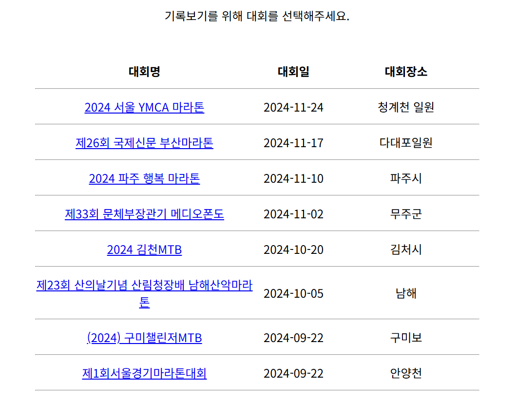 홈페이지에 나열된 대회 목록에서 본인이 참가한 대회를 선택합니다. 대회명, 날짜, 장소 등의 정보를 통해 정확한 대회를 찾을 수 있습니다. - 이름 또는 배번 입력