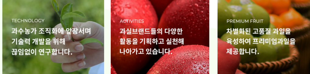 좋은 품질의 과일을 생산하기 위해 품종 개발, 병해충 방제 기술 연구, 재배 기술 향상 등에 집중 투자하고 있습니다. 이를 통해 국내 과일의 경쟁력을 높이고, 해외 수출 시장에서도 품질로 인정받을 수 있도록 지원합니다.