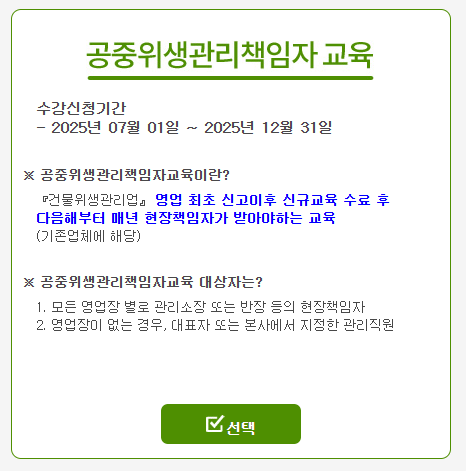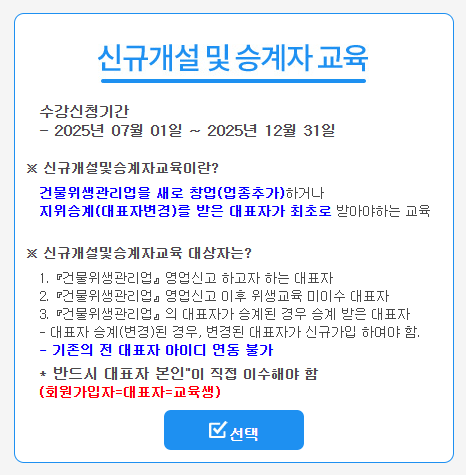 특히 교육 수료는 법정 요건에 해당하기 때문에, 일정한 자격과 사업 운영을 위해 필수적으로 이수해야 합니다. 일부 지방자치단체의 위생관리 입찰 조건에서도 교육 이수 여부가 평가 항목으로 반영되기 때문에 더욱 중요합니다.
