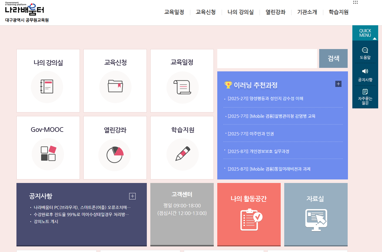 나라배움터는 PC와 모바일 모두에서 접근 가능하며, 언제 어디서든 다양한 콘텐츠를 수강할 수 있다는 점에서 활용도가 높습니다. 특히 대구광역시 공무원교육원과 연계된 교육과정은 지역 특성과 직무 환경을 반영한 내용으로 구성되어 있어 현장 실무에 바로 적용할 수 있는 장점이 있습니다.