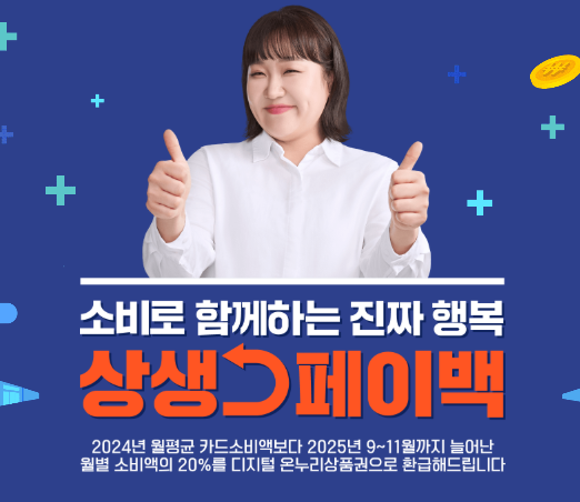상생페이백은 2024년 월평균 카드소비액보다 2025년 9~11월사이 소비액이 더 높을 경우 20%를 온누리상품권으로 환급해주는 정부지원금입니다. 아래 링크를 통해 홈페이지에 바로 접속가능합니다.