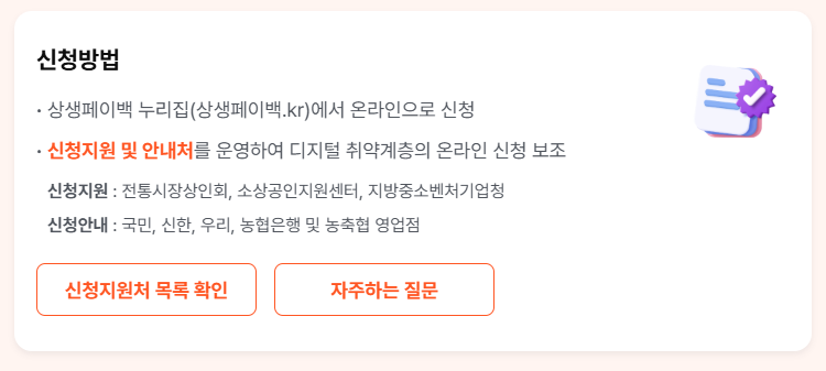 온라인 신청이 어려우신 분들을 위해 전통시장 상인회, 소상공인지원센터, 일부 은행 영업점 등에서 신청 지원이 이루어집니다. 다만, 오프라인은 ‘지원’ 역할이며 실제 신청 접수는 온라인을 통해 이루어지는 경우가 많습니다.