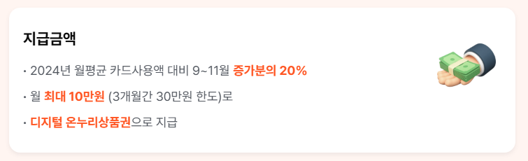 -환급 비율은 2025년 9~11월의 카드 소비액이 2024년 월평균 카드 소비액보다 많을 경우, 그 증가분의 20%를 돌려줍니다.