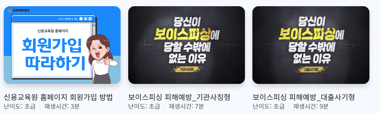 신용교육원에서는 자율학습이 가능한 온라인 강의를 풍부하게 제공하고 있습니다. ‘신용관리의 이해’, ‘올바른 소비습관’, ‘채무조정제도 안내’, ‘개인회생·파산 이해’ 등 실생활과 밀접한 내용을 담고 있어 교육 후 바로 실천에 옮기기 좋습니다.