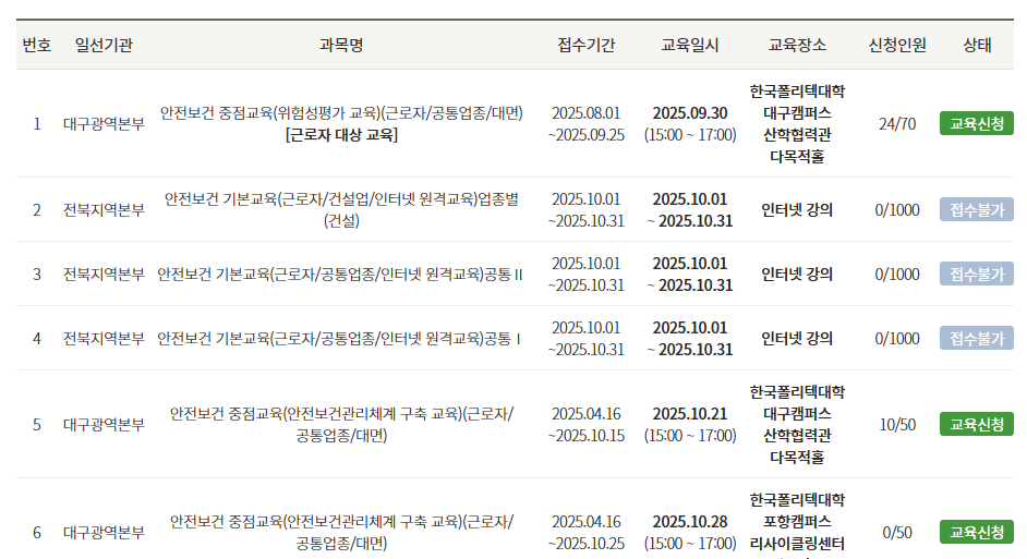 산업 현장에서 발생하는 안전사고는 사전 예방이 가장 중요합니다. 안전보건공단 안전보건교육포털을 통해 법정 교육을 빠르고 편리하게 이수하고, 근로자의 안전과 건강을 지키는 첫걸음을 시작해 보시기 바랍니다. 산업안전보건법 준수는 물론, 현장 사고 예방과 기업 신뢰도 향상에도 큰 도움이 될 것입니다.