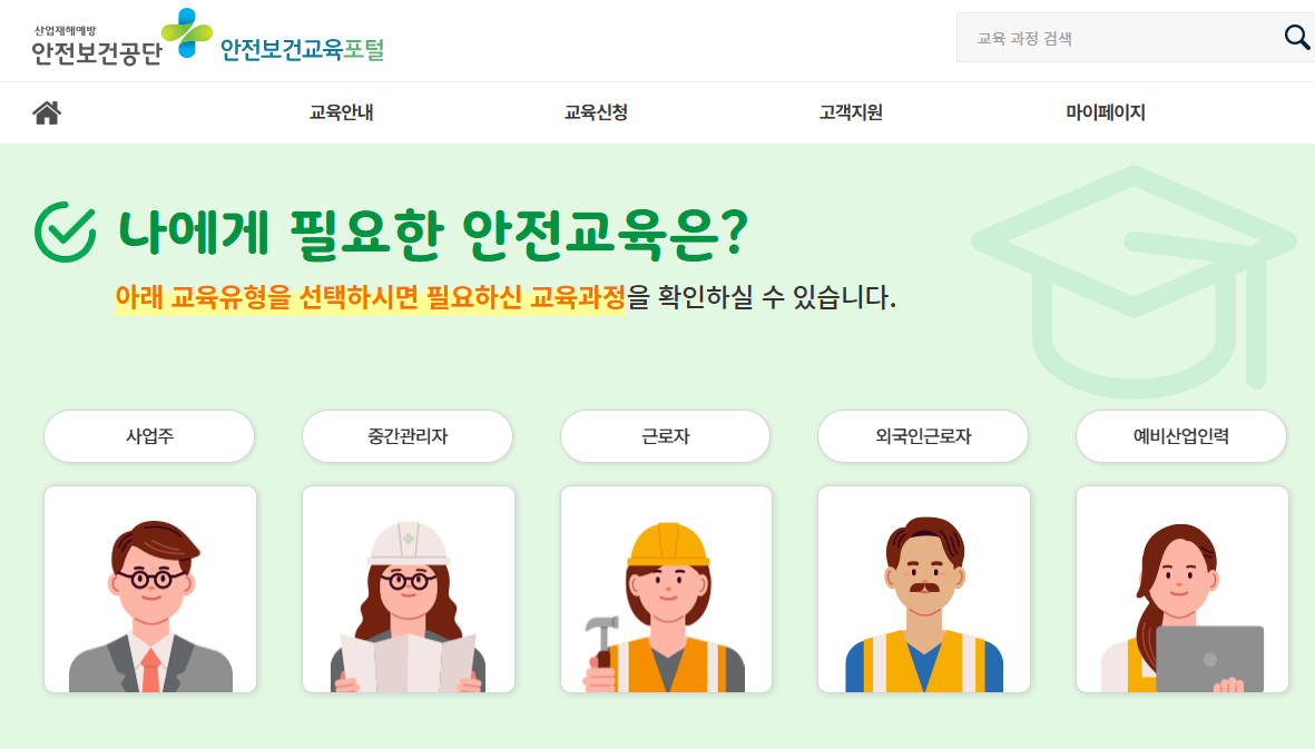 안전보건공단 안전보건교육 포털은 사업주, 관리자, 근로자등을 위한 안전보건 교육과정을 제공하는 사이트입니다.