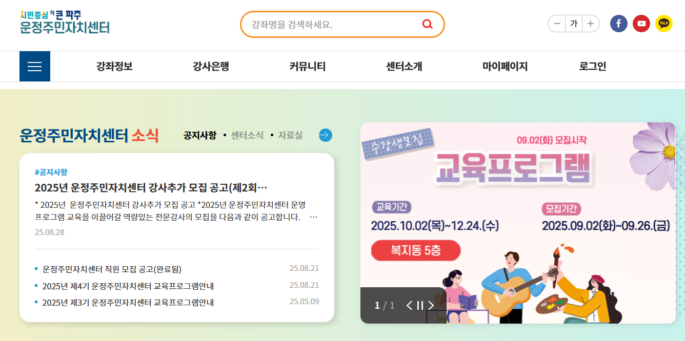 파주 운정지구는 신도시 개발과 함께 빠르게 변화하고 있는 지역 중 하나입니다. 이 속에서 지역주민의 소통과 참여, 문화 향유를 위해 중심적인 역할을 하고 있는 곳이 바로 운정주민자치센터입니다.