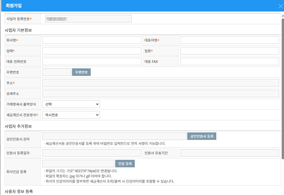 전자세금계산서 발행을 위해서는 사업자용 공동인증서(구 공인인증서)가 필요합니다. 홈페이지 내 인증서 등록 메뉴에서 인증서를 등록하면 발행 권한이 부여됩니다. 발행한 세금계산서는 [세금계산서 관리] 메뉴에서 확인할 수 있으며, 필요 시 수정세금계산서 발행, 취소처리 등도 가능합니다.