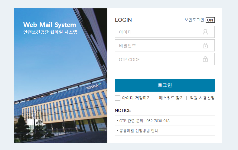 웹메일은 안전보건공단 내부망과 외부망 모두에서 접근이 가능합니다. 특히 외부에서도 안전하게 접속할 수 있도록 VPN 기반 보안 접속 환경이 마련되어 있으며, 공단 임직원은 웹메일 포털 페이지에서 본인의 인증 정보를 입력해 로그인할 수 있습니다.