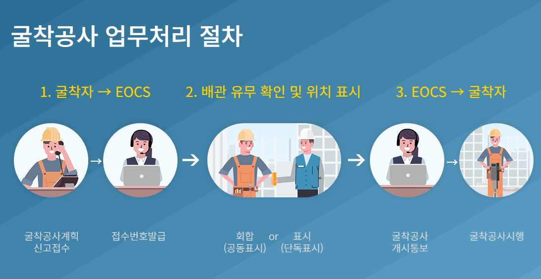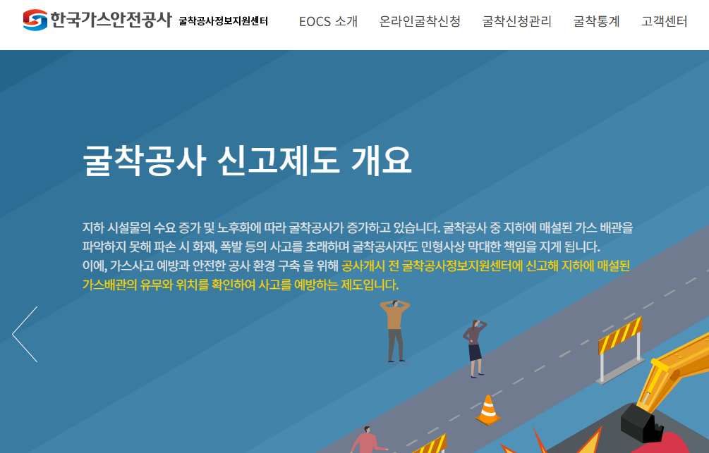 공사 전 신고 없이 굴착을 진행할 경우 가스 배관 파손으로 인한 대형 사고 위험이 높아지는데, 이를 예방하기 위해 2008년부터 전국적으로 시행하고 있는 ‘EOCS(Excavation One-Call System)’를 운영하며, 굴착공사자와 가스사업자 간 정보 교류를 원활하게 합니다.