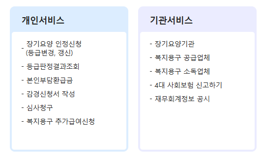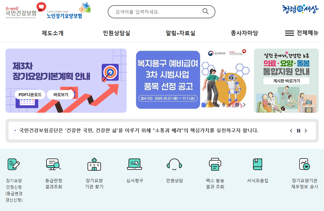 노인장기요양보험공단 홈페이지는 고령이나 치매, 뇌혈관성 질환 등 노인성 질병으로 일상생활 지원이 필요한 어르신을 위한 장기요양급여 관련 정보를 한눈에 제공하는 통합 플랫폼입니다.