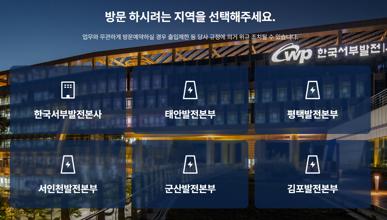 한국서부발전 출입관리시스템은 국가 중요 기반시설인 발전소를 대상으로 외부 방문자, 협력업체 직원, 차량, 자재 등의 출입을 체계적이고 안전하게 관리하기 위해 구축된 온라인 기반 서비스입니다.
