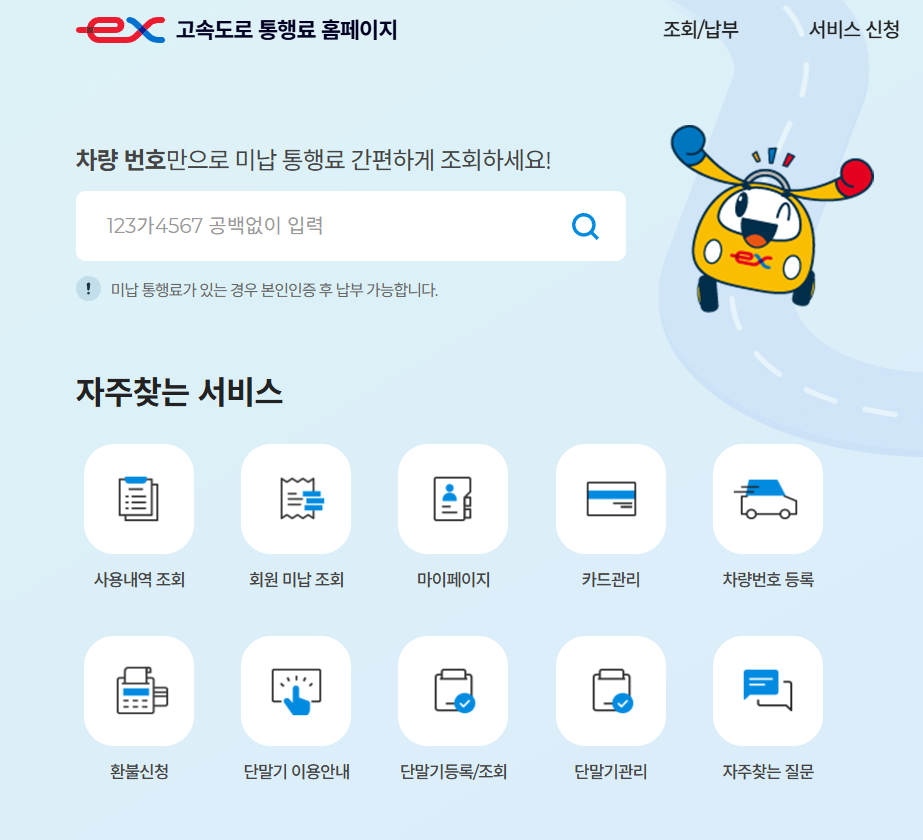 차량 번호만으로 미납 통행료 간편하게 조회하세요! 미납 통행료가 있는 경우 본인인증 후 납부 가능합니다.