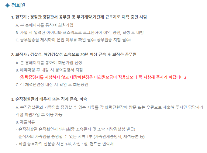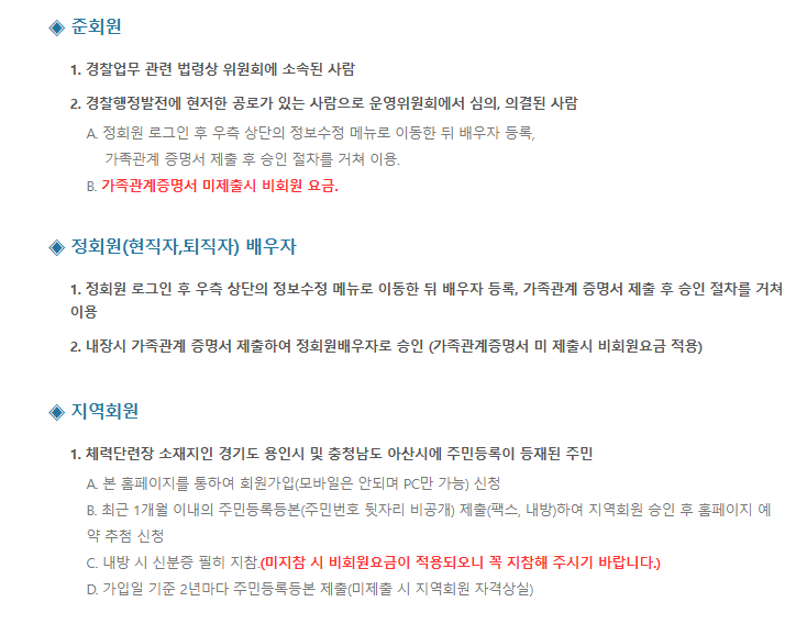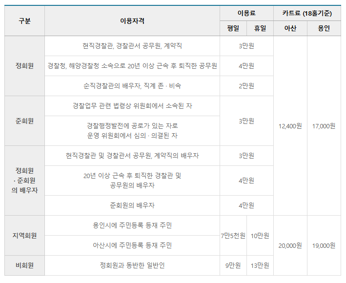 정회원은 현직 경찰관과 경찰 공무원, 일정 기간 이상 근무한 퇴직자, 그리고 순직 경찰관의 가족 등이 해당됩니다. 준회원은 경찰 관련 위원회 소속자나 경찰 행정에 기여한 인물 등이 포함될 수 있으며, 지역 주민을 위한 지역회원 제도도 마련되어 있습니다. 비회원은 정회원과 동반 시 이용이 가능하지만 요금이 높게 책정됩니다.