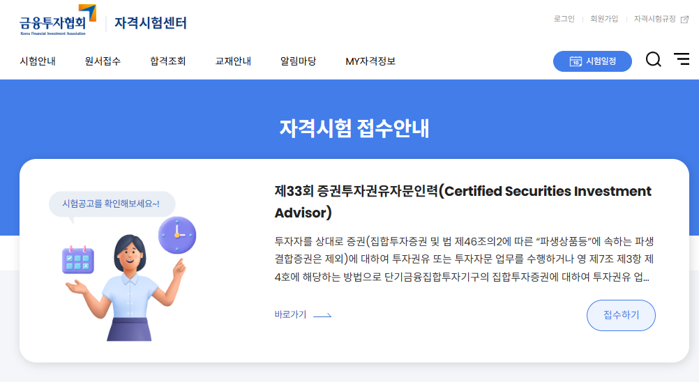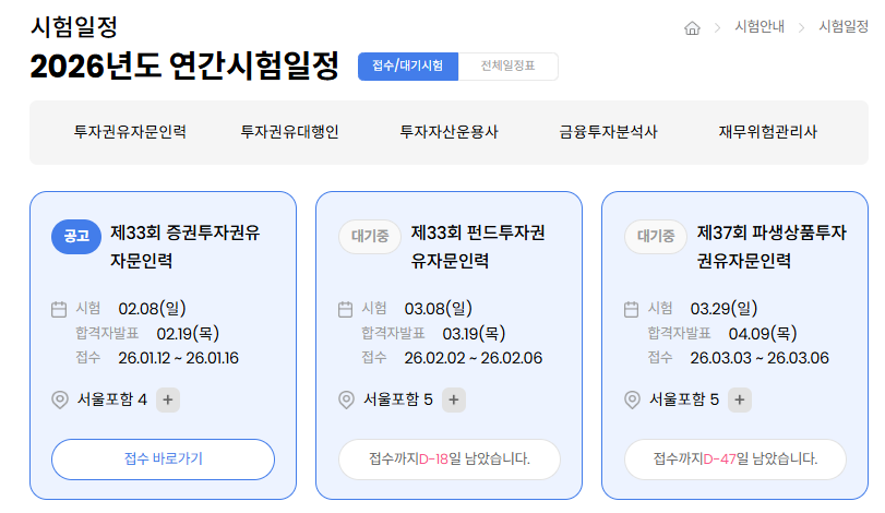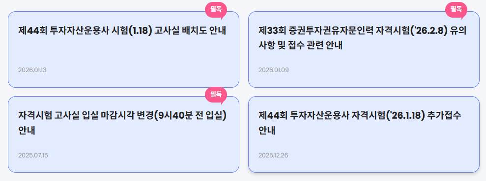 - 자격시험 공고 확인: 증권투자권유자문인력, 펀드투자권유자문인력 등 각종 시험의 일정을 확인할 수 있습니다.