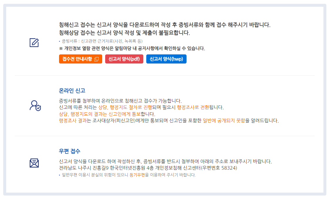 신고센터는 온라인 신고를 기본으로 하며, 전화 상담 또는 우편과 방문 접수도 받을 수 있도록 되어 있어 다양한 방법으로 개인정보 침해 문제를 해결할 수 있는 창구 역할을 하고 있습니다.