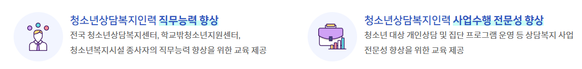 - 직무 이러닝연수: 청소년상담복지센터 신규 직원이나 학교밖청소년지원센터 직원 등 직무별 필수 역량 교육