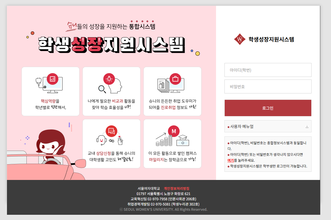 서울여대 학생성장지원시스템은 서울여자대학교 재학생이 대학생활 전반을 체계적으로 관리할 수 있도록 만든 공식 온라인 플랫폼입니다. 해당 사이트 바로가기는 다음과 같습니다.