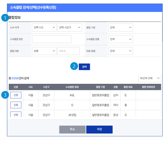 - 서비스 선택: 메인 메뉴에서 선수 등록, 대회 참가, 클럽 관리 등 원하는 서비스를 선택합니다.