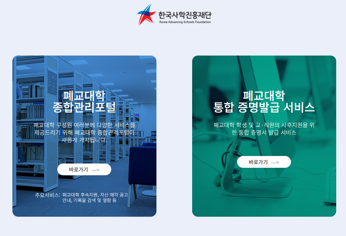 폐교 대학 통합증명발급서비스는 폐교대학 학생과 교직원의 학적·경력 기록을 통합해 증명서를 발급해 주는 플랫폼입니다. 해당 사이트 바로가기는 다음과 같습니다.