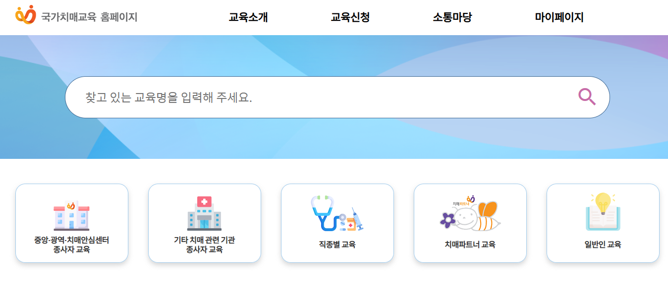 - 교육과정 선택: 치매전문교육 스마트 e-러닝 과정 메뉴를 찾아 선택합니다.