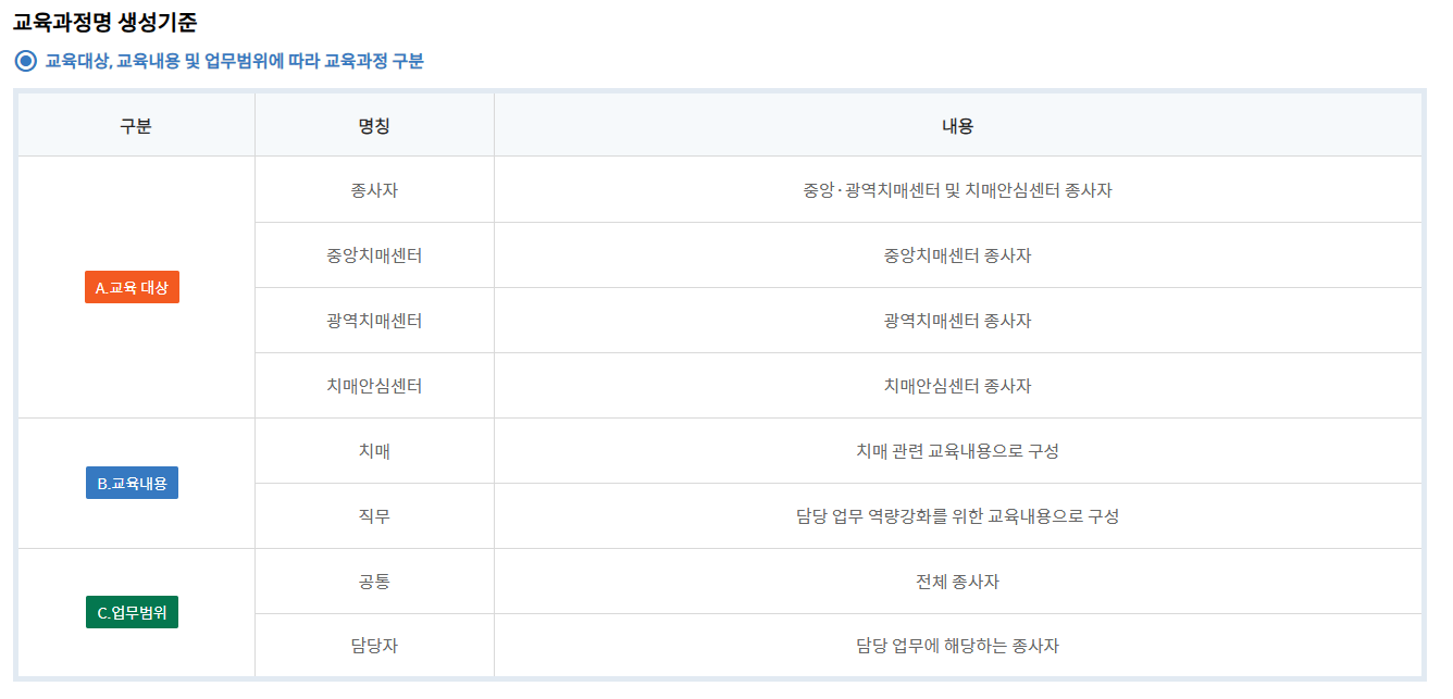 - 교육과정 선택: 치매전문교육 스마트 e-러닝 과정 메뉴를 찾아 선택합니다.