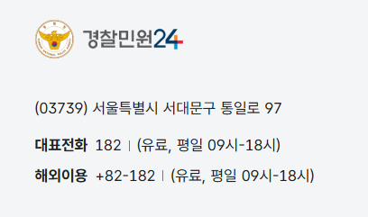 경찰민원24시 홈페이지 이용 중 도움이 필요하거나 문의할 사항이 있을 경우, 대표 콜센터 182로 전화해 안내를 받으실 수 있습니다. 이 서비스는 평일 오전 9시부터 오후 6시까지 운영되며, 해외에서도 +82-182로 연락 가능합니다.