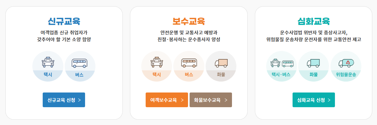• 신규교육 과정: 운수업에 처음 진입하는 운전자들을 위한 기본 교통 안전 및 직무 교육을 제공합니다.