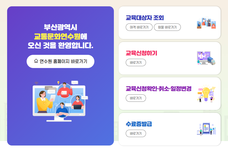 부산교통문화연수원 홈페이지는 부산광역시의 버스운전사, 택시운전사, 화물운송종사자, 위험물차량 운전자등의 운수업 종사자들이 필수로 받아야 하는 보수교육을 제공하는 공식 사이트입니다.