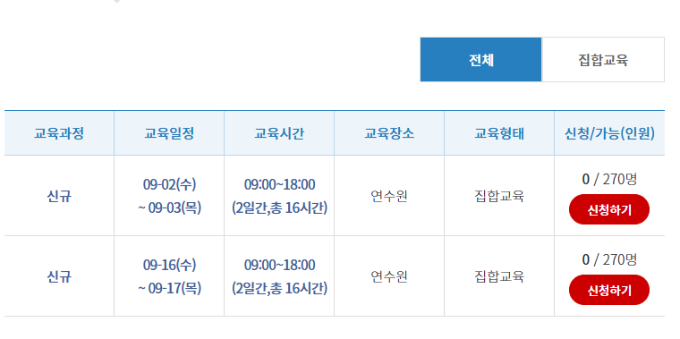 로그인 후에는 ‘교육신청’ 메뉴에서 신규교육, 보수교육, 심화교육 등 필요한 과정의 일정을 확인합니다. 원하는 교육 날짜를 선택한 뒤 신청 절차를 진행합니다.